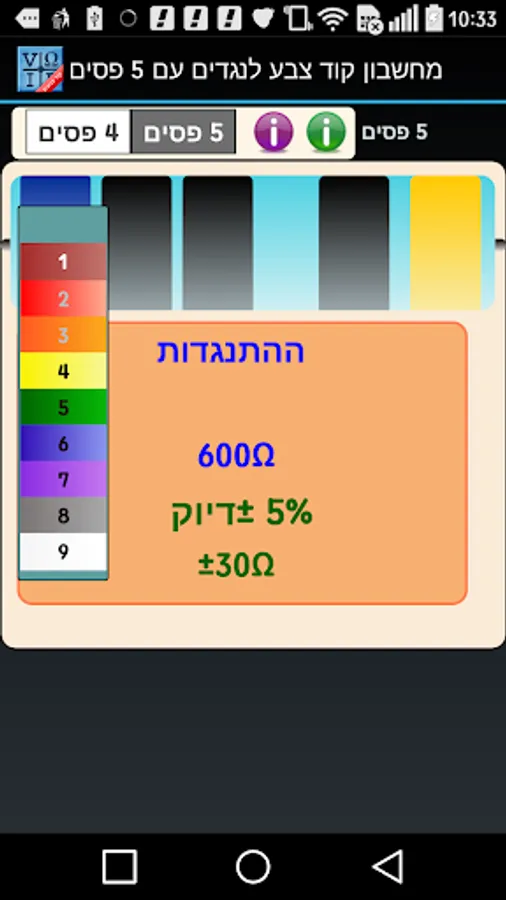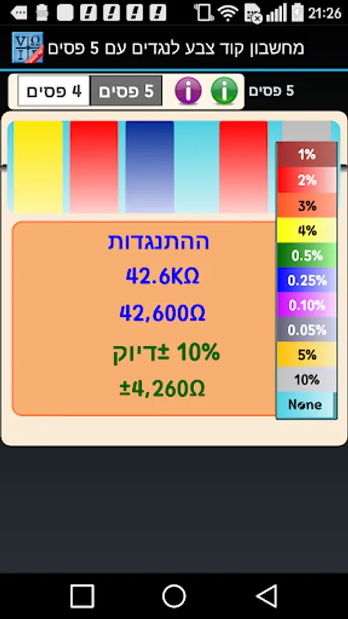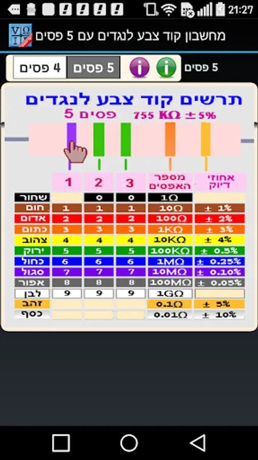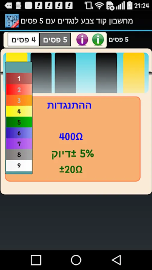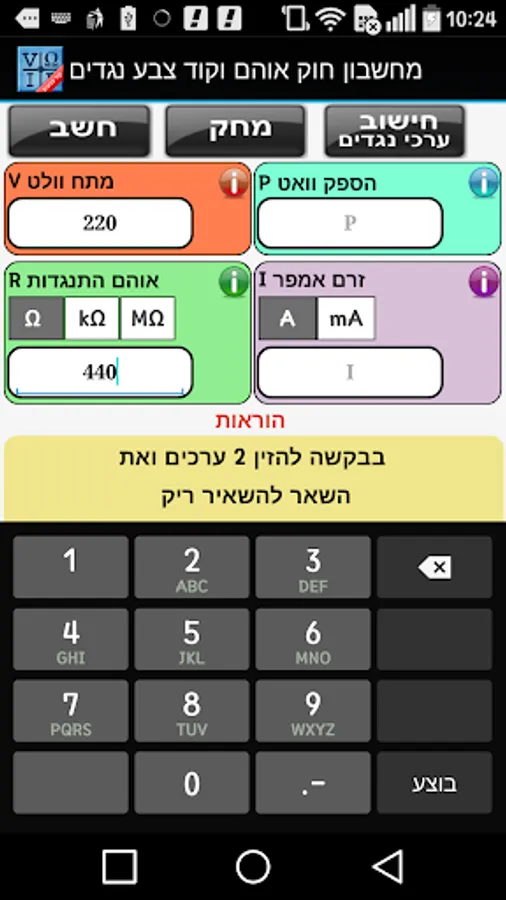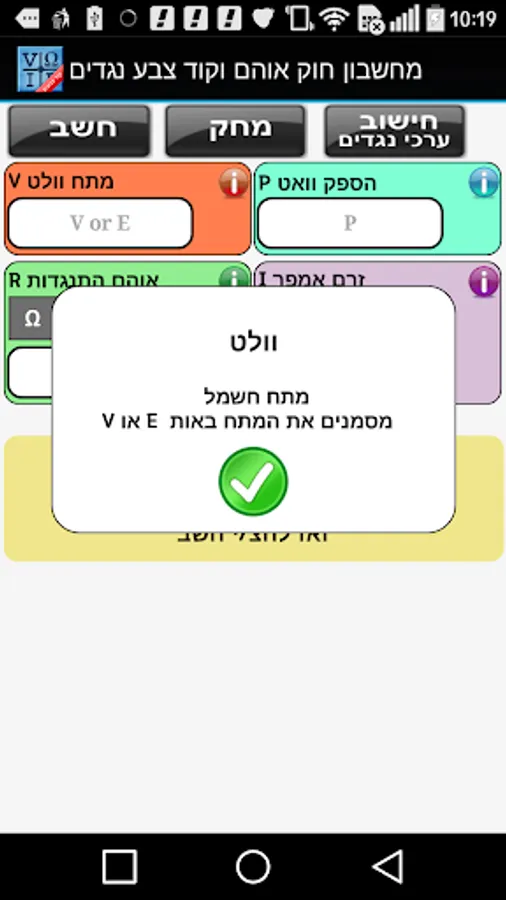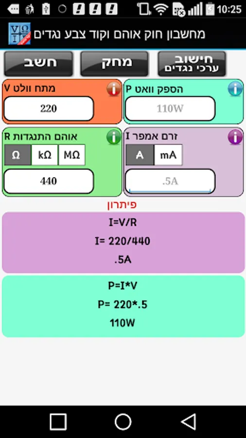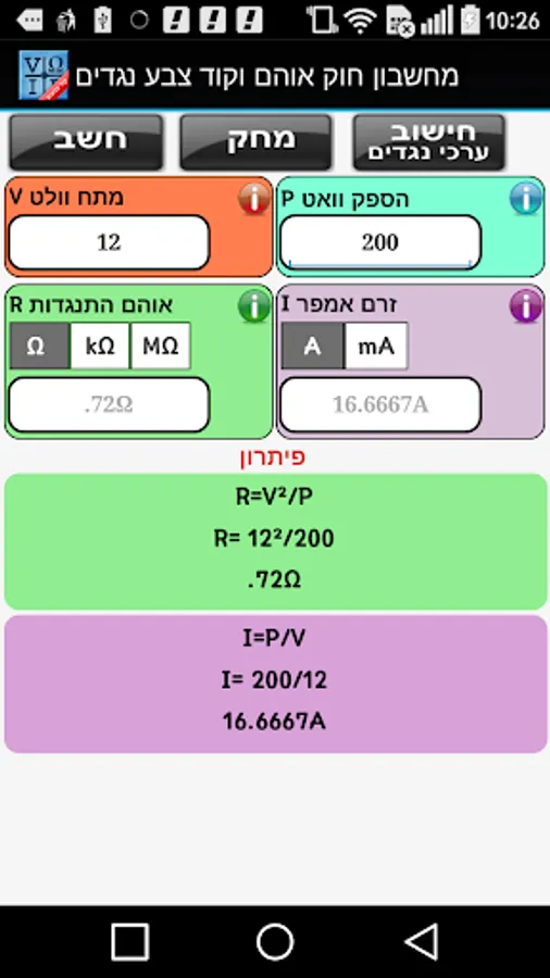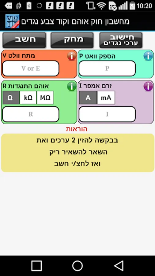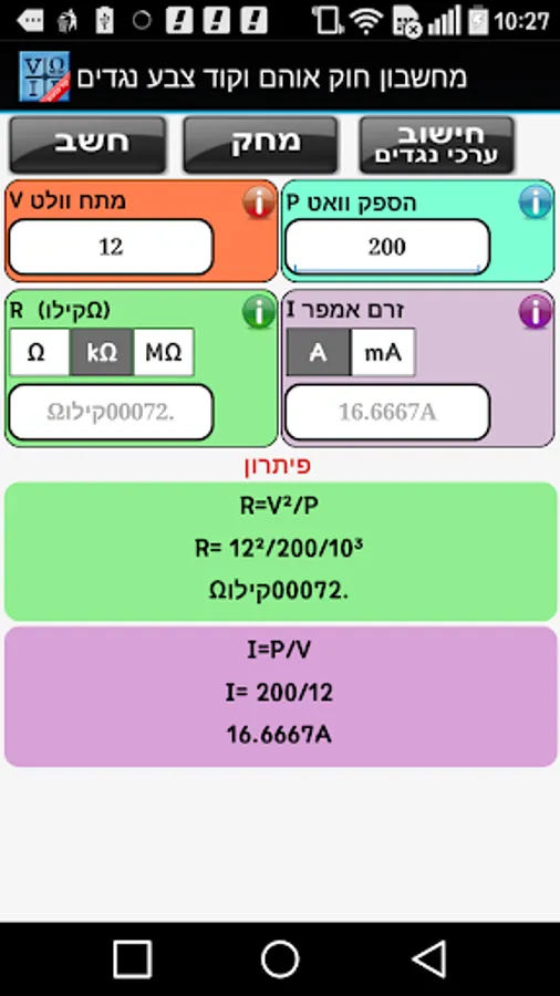 With this application it will be very easy for you to perform all the required calculations and just enter 2 values for example: volts and ampere and press calculate and you will get the formulas and solution in both ohms fields (resistivity) and power (current) can also choose milliamp. Tip: Click Next. It is also very easy to calculate the value of the resistors. Select 4 or 5 bars, then press the resistor and the counter value appears. Helps you develop an electric circuit.