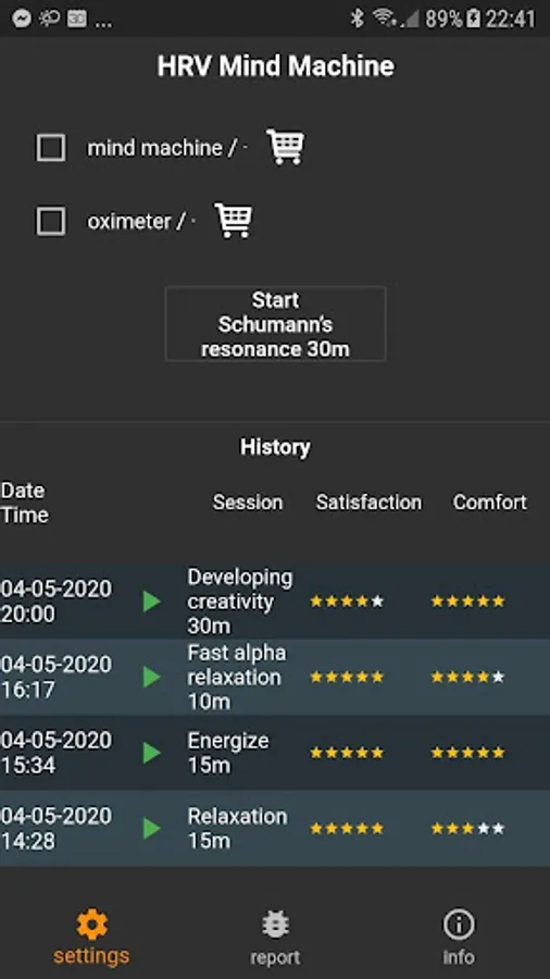 After launching the application, you choose whether to use an oximeter, light stimulation, sound stimulation will always run. In the settings, you choose a specific program, the color of stimulation, and press start. You can end the program yourself or it will end after the time of the specific program. After the end of the program in case of using an oximeter how your key parameters have changed. Also important is your evaluation of whether something from the surroundings disturbed you and how satisfied you were with the specific program. Everything is stored in your history, where you can choose a program based on the measurements and also your evaluation. In history, it is also possible to view the complete HRV measurements in graphs.