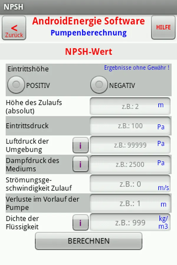 Calculation of NPSH value (holding pressure level, net positive suction head)