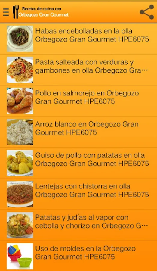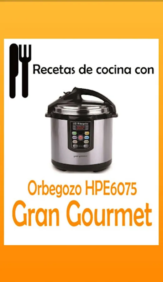 Application that includes recipes for cooking with programmable pots and kitchen robots that cook without pressure. It includes all kinds of recipes classified by sections and which can be made with the Orbegozo Gran Gourmet programmable pot (HPE6075).