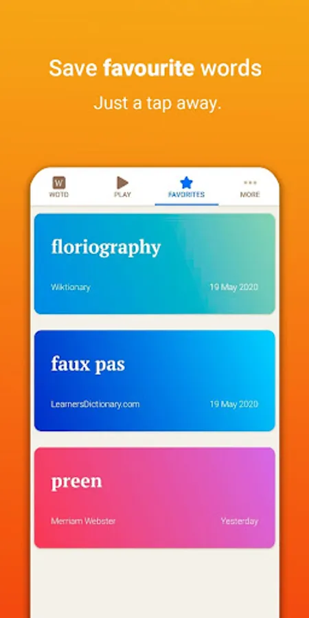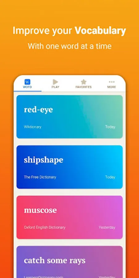 Download the word of the day app to Improve your English vocab and learn new english words without causing information overload. Prepare for exams like SAT, GRE, GMAT, IELTS, TOEFL, CAT, etc.