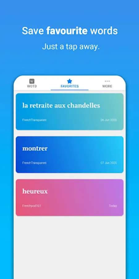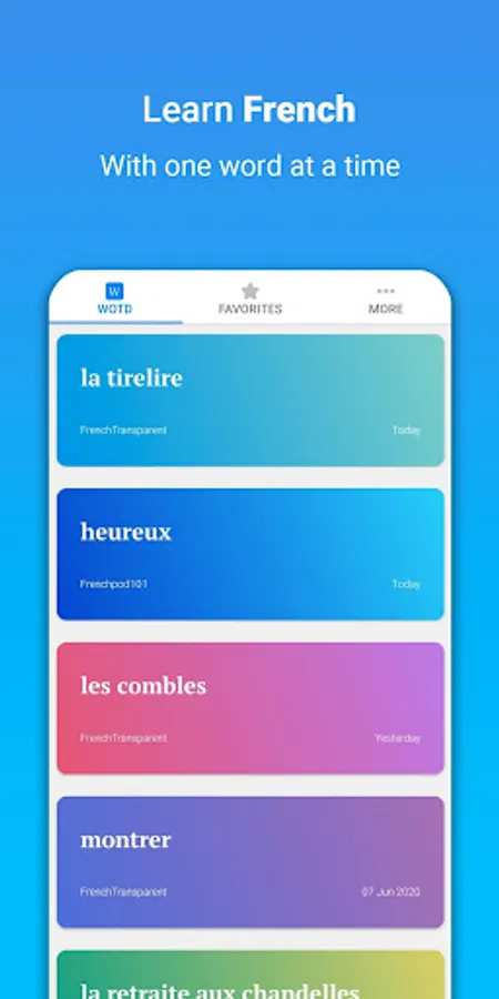 Relevant and useful French words are added daily from trusted sources. Every word has Synonyms, Antonyms, One-word substitutions, Foreign Words & Phrases, Idioms & Phrases, Phrasal Verbs, and Important Words.
