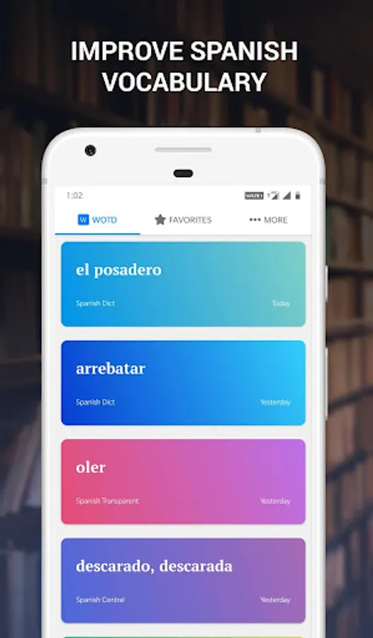 With 'Word Of The Day' format, learning new words each day become very easy. The app offers a rich vocabulary without causing information overload. Relevant and useful Spanish words are added daily from trusted sources. Every word has Synonyms, Antonyms, One-word substitutions, Foreign Words & Phrases, Idioms & Phrases, Phrasal Verbs, and Important Words.