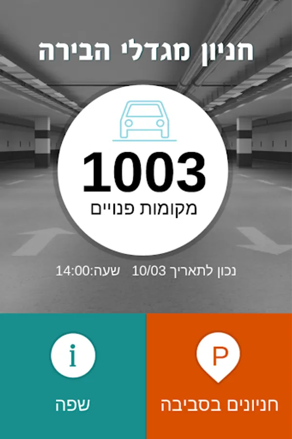 The app is used by government workers who work in the capital Towers building in Jerusalem, the purpose of the app is to present facts before arriving at the office if there are parking spaces available in the parking lot of the building and to shorten the search time of parking on arrival to the workplace. The application presents additional parking also established that there are nearby.