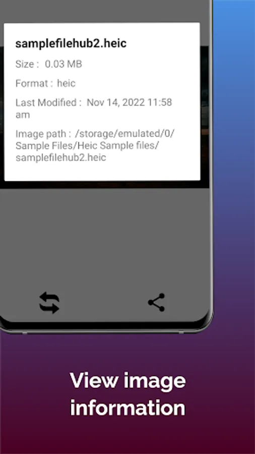 Download this HEIC image viewer App to view major HEIC images, convert HEIC images, share HEIC images easily and check for image information.