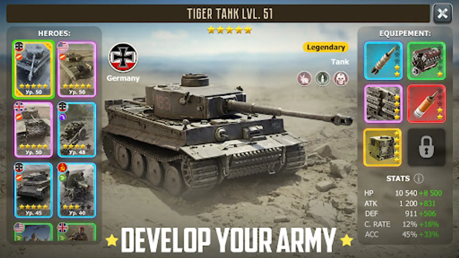 + Unlock new powerful heroes and construct strong card decks to defeat your opponents in the legendary battles of the WW2 machinery.