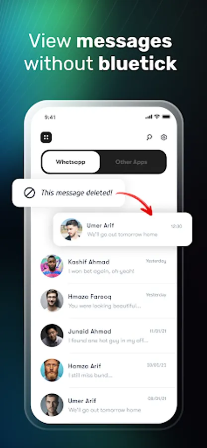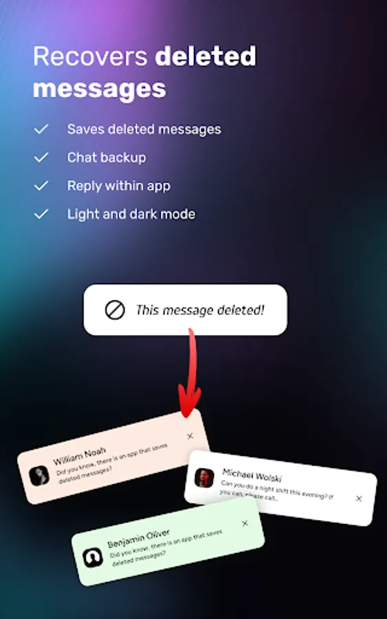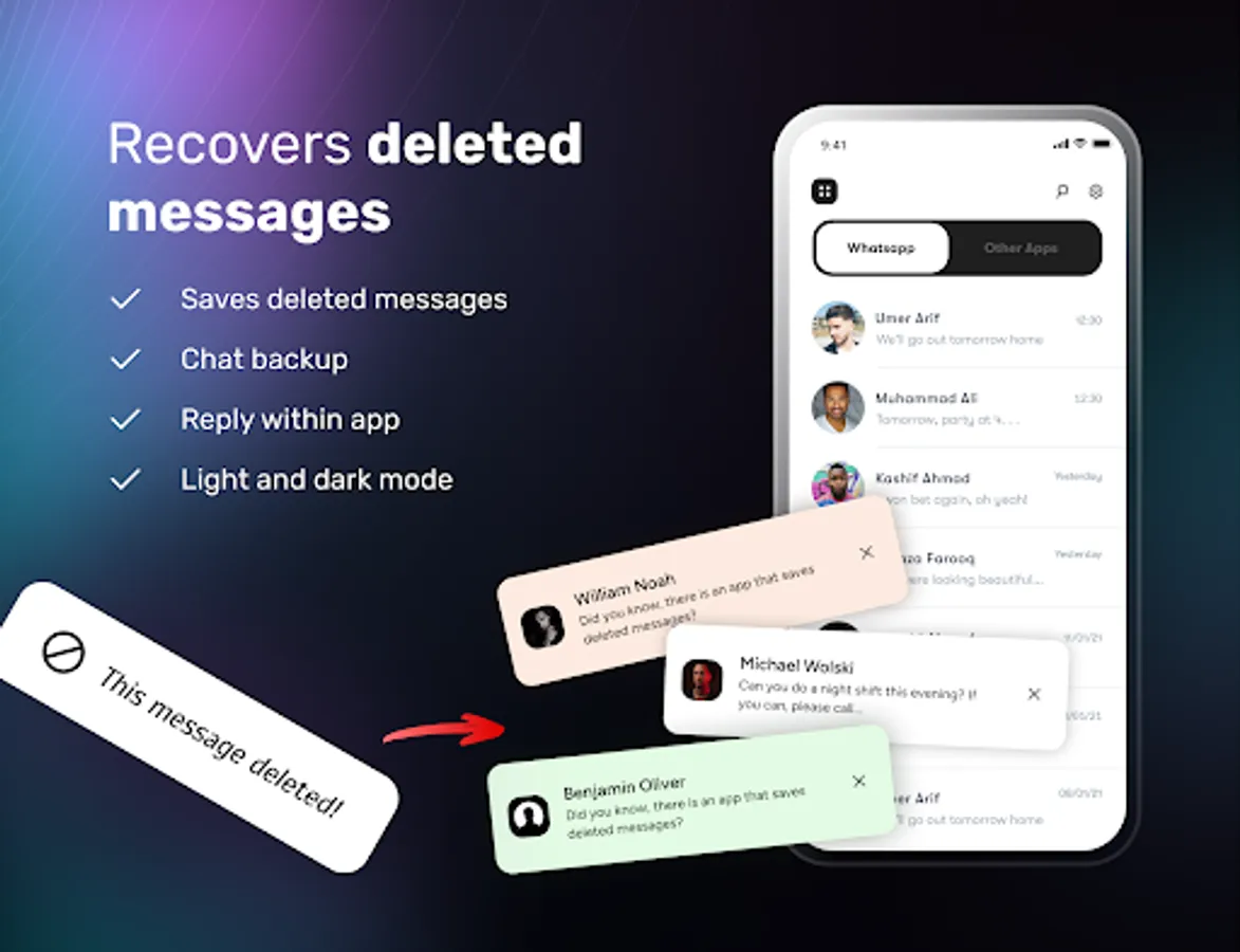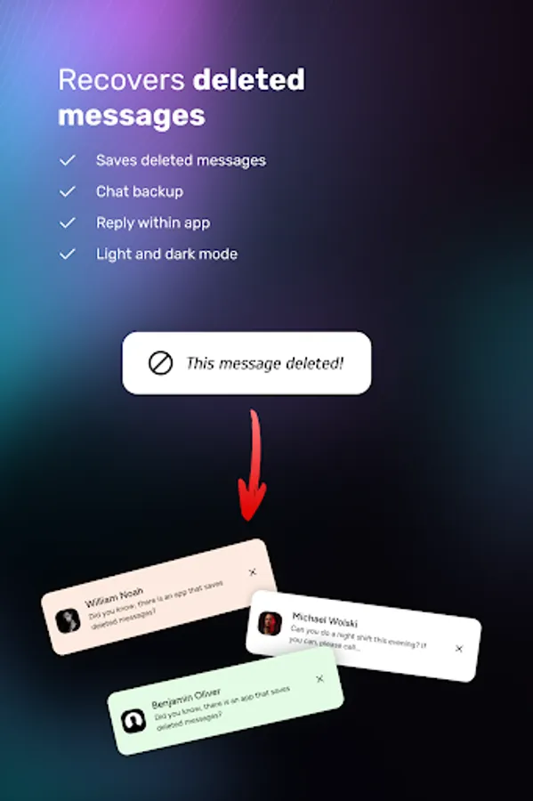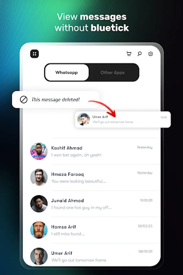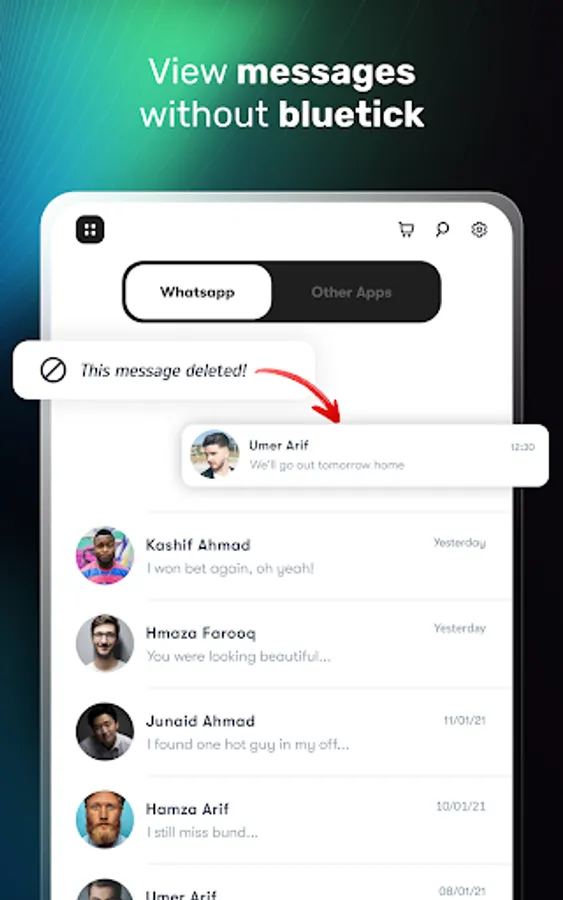 Besides reading messages offline, you can also recover deleted messages of WhatsApp, Messenger and other App's notifications. StealthChat (Hide Blue Ticks or Last Seen) app notifies you whenever any message deleted and auto recover deleted messages. You can view deleted messages without knowing your friends.
