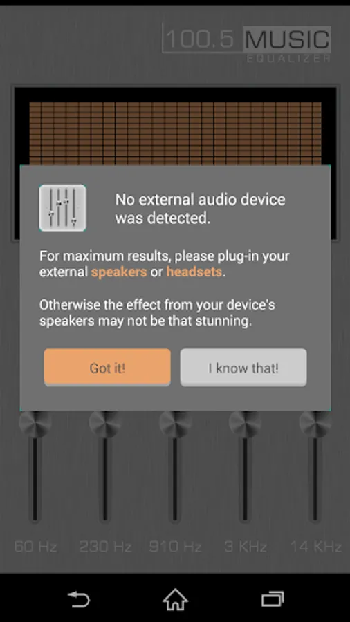 Boost your device's sound quality with this easy to use 5 band Equalizer and make it sounds like a HiFi system.
