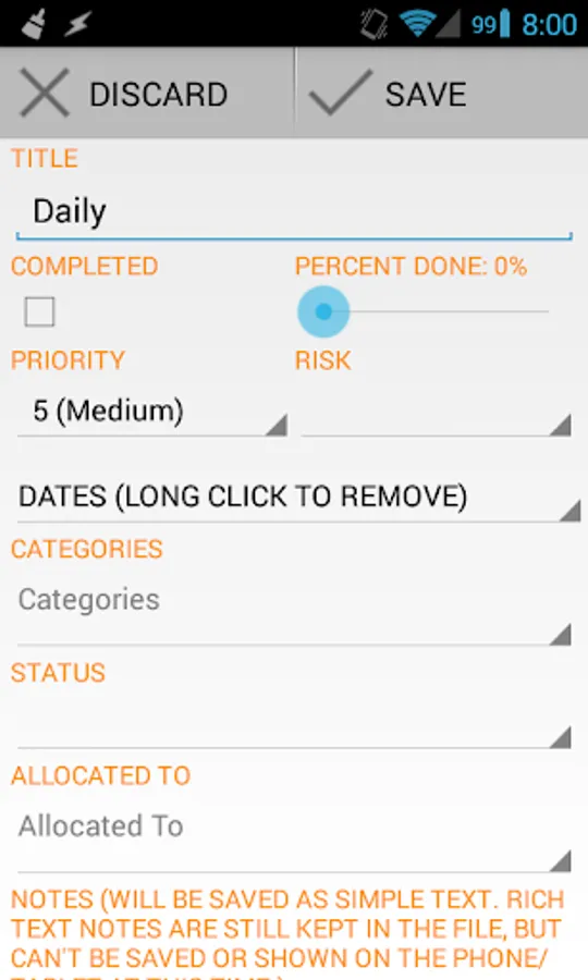 List can be sorted (both ways) based on due date (can also use calculated dates), title, category, completion or priority,risk, status, allocated to, or it can be unsorted.