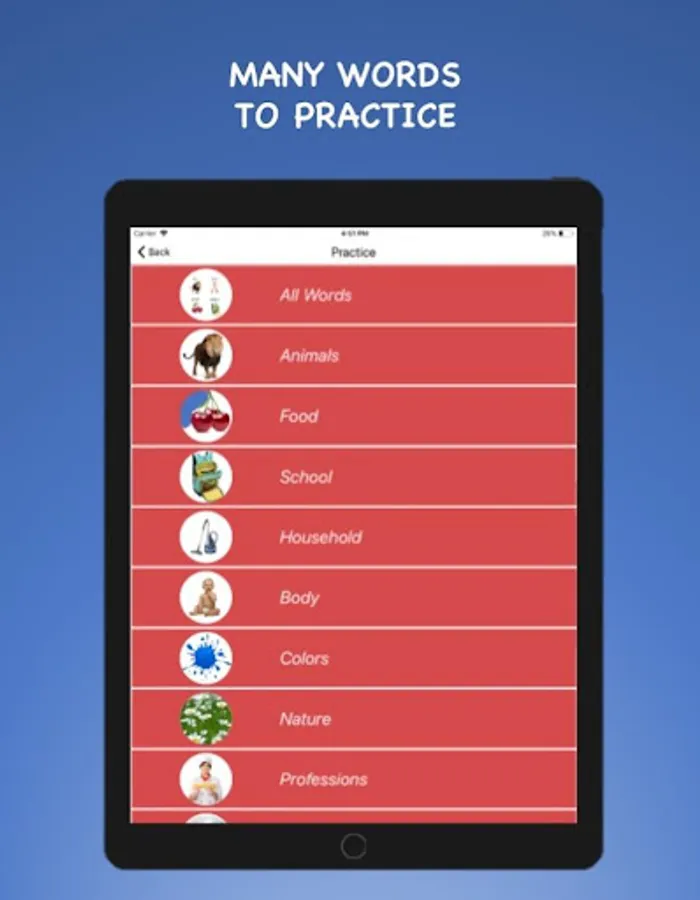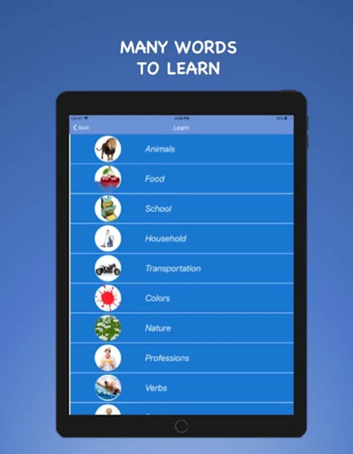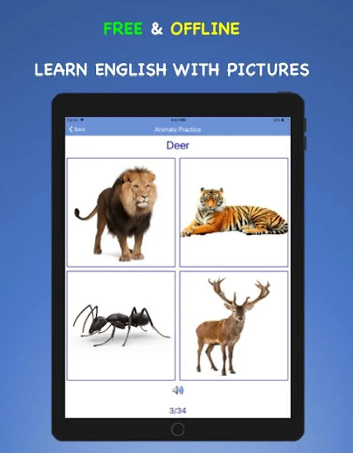 Learning Basic English Words with flashcards and their pronunciation. English vocabulary learning aims to teach English in a simple way without getting bored with pictures and flashcards. It covers basic English words for beginners. Learning English vocabulary has a simple and user-friendly structure. It offers basic English words with different groups that can be easily used. It does not require any registration to use . Learn English Vocabulary app consists of two main parts. While the first part teaches basic English words with the help of flashcards, the learned vocabulary are tested in the second part. Learning English vocabulary offers a funny way to memorize the words. You can find the easiest way to learn and memorize English words with this application. You don't need to know English to use the menus.