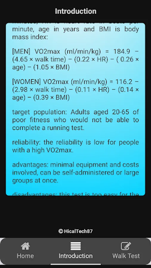 This application is an aid in determining the fitness level of the physical test 2-Km Walking Test.