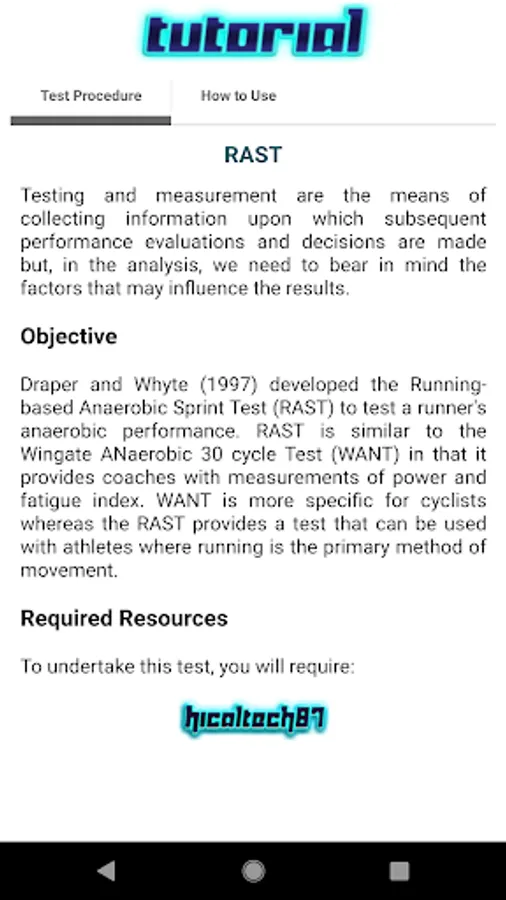 Draper and Whyte (1997) developed the Running-based Anaerobic Sprint Test (RAST) to test a runner's anaerobic performance. RAST is similar to the Wingate ANaerobic 30 cycle Test (WANT) in that it provides coaches with measurements of power and fatigue index. WANT is more specific for cyclists whereas the RAST provides a test that can be used with athletes where running is the primary method of movement.