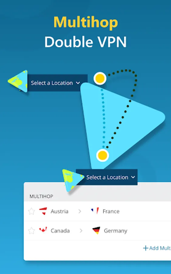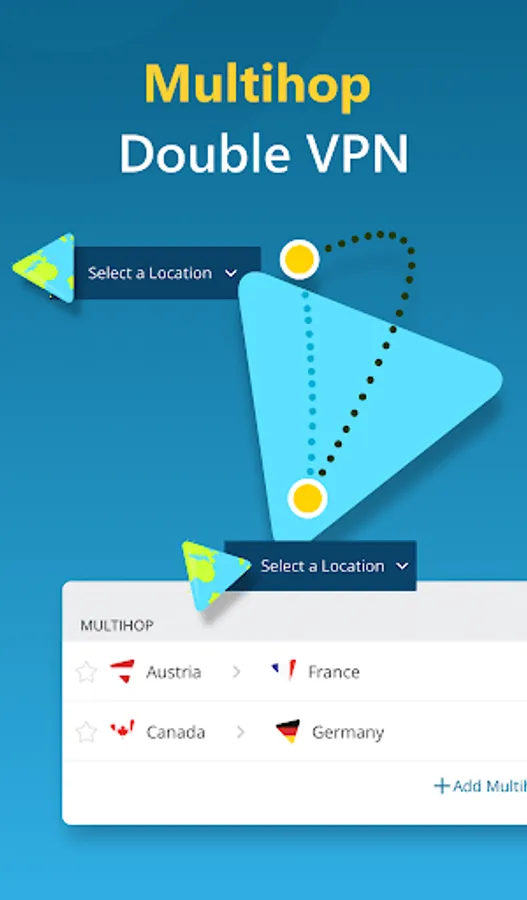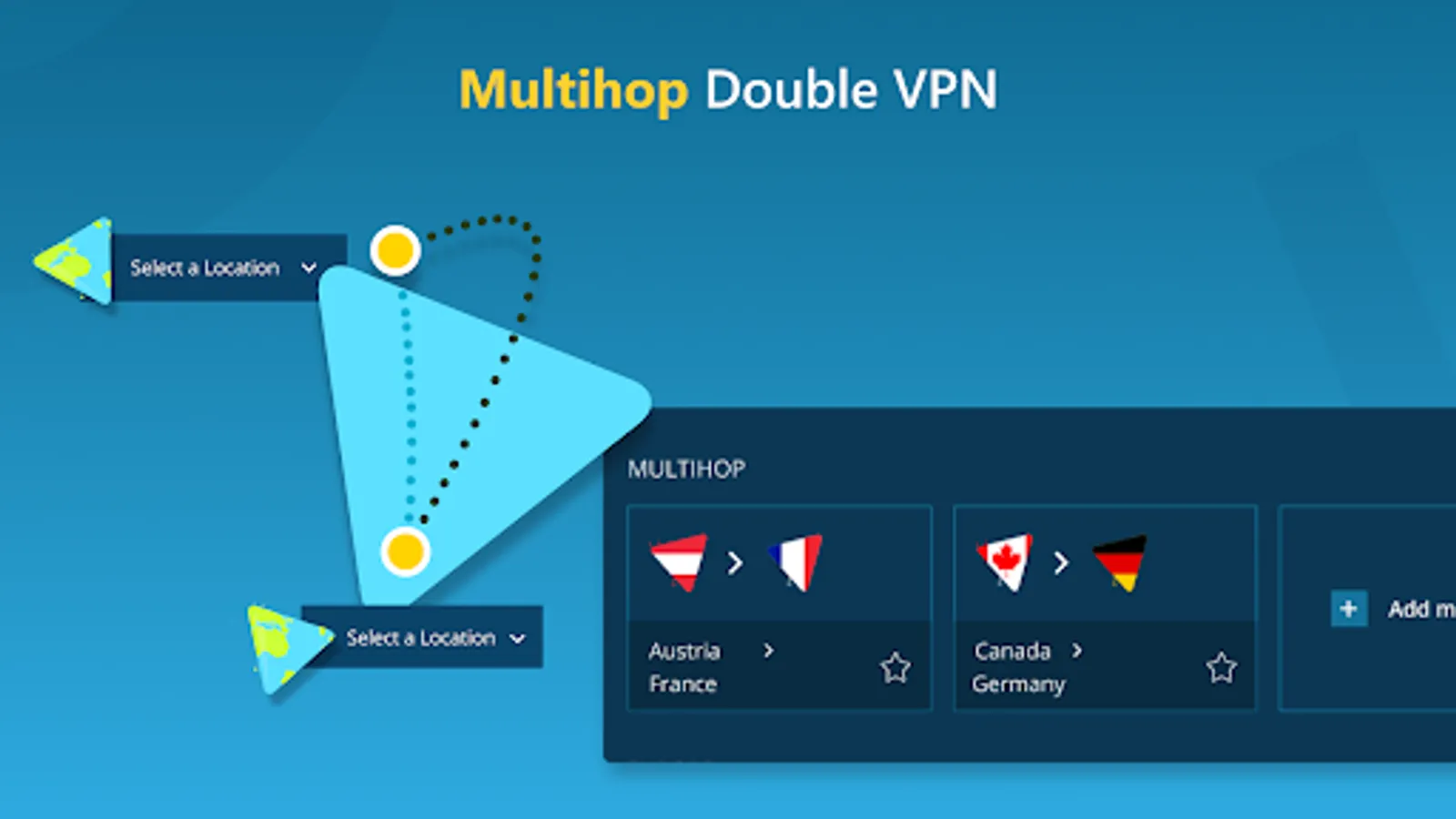 With Multihop you will be able to select an entry and exit server for your connection, helping bypass things such as censorship and surveillance. It can even result in better speeds in some cases. Tunnel your connection over multiple VPN locations. Double the shield, with maximum protection.