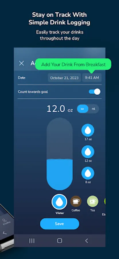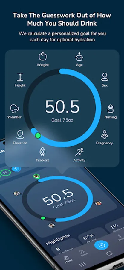 -Daily water goal automatically calculated based on your weight, age, height, sex, activity level, weather and more
