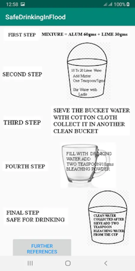 The 100 gms sachet used contained Ferric Alum, Lime and Bleaching Powder and each packet purified approximately 20 litres of turbid water. Ferric Alum, Lime and bleaching powder are contained in small packets separately in powder form. Space is also arranged for in advance to grind the Ferric Alum & Lime