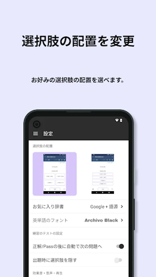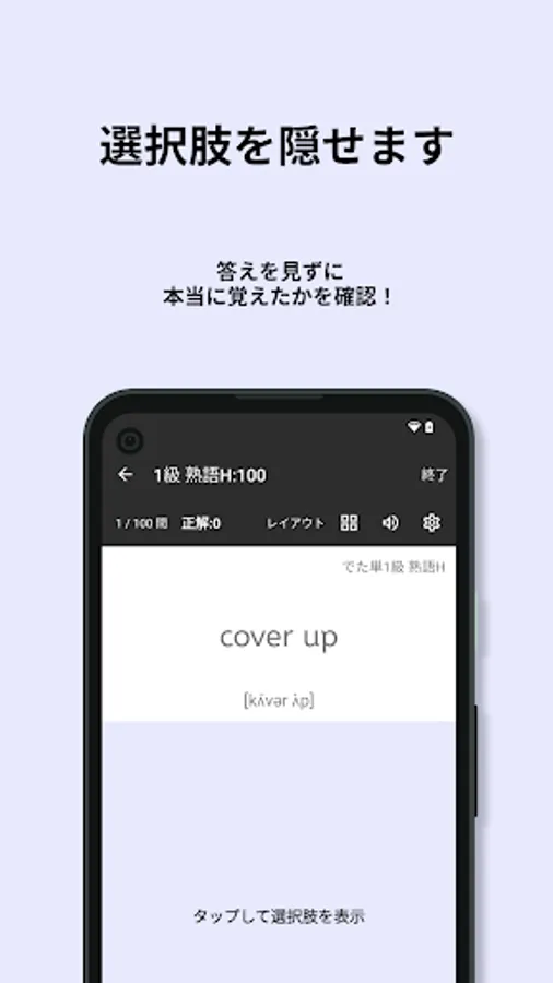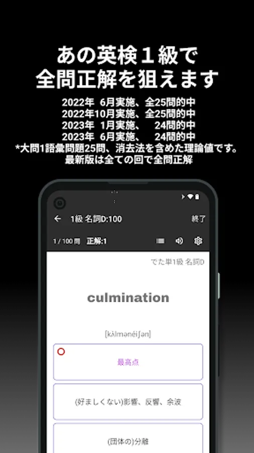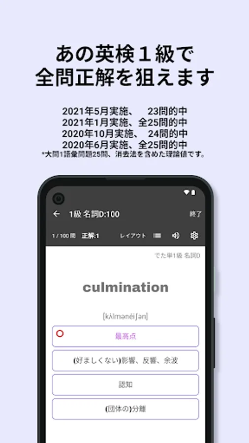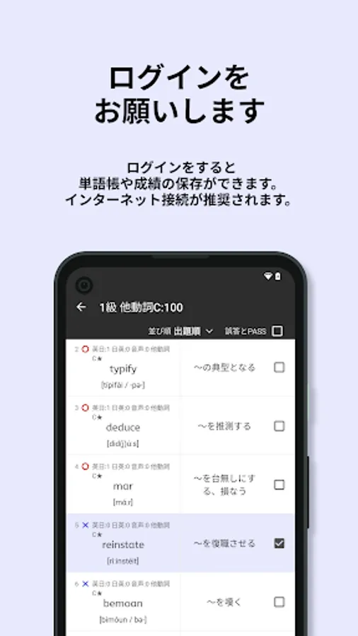 Eiken vocabulary questions are often asked from the past, and frequently used words are repeatedly asked. Stage 1 in the app summarizes the words that were given as correct answers and the words that were given many times as choices. By studying the range of stage 1 preferentially, you can approach the passing score efficiently.