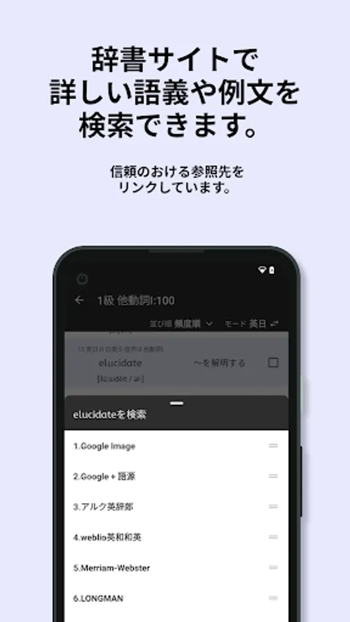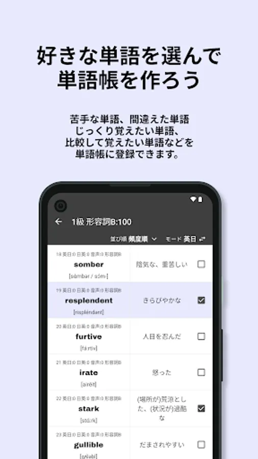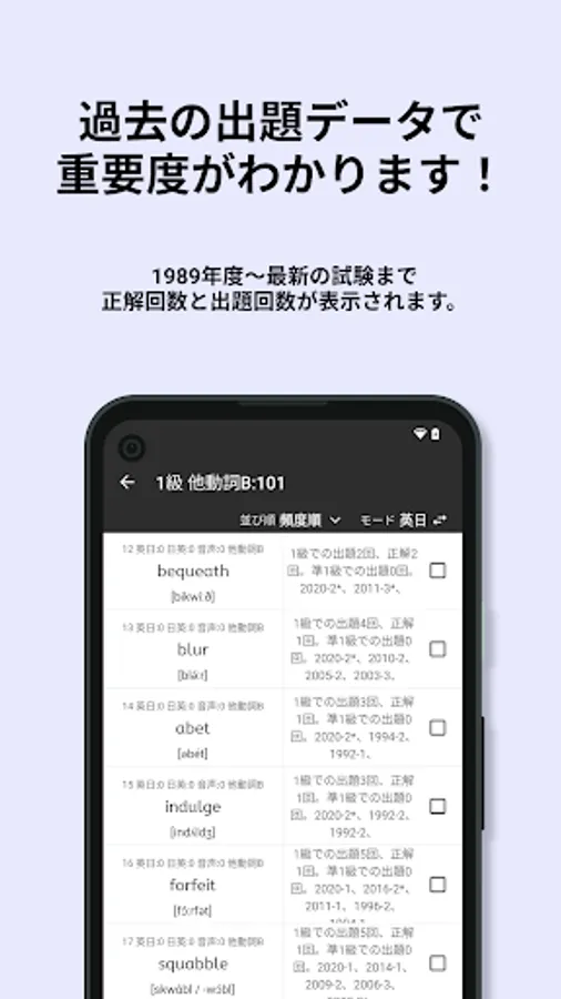 In this app, words are categorized by parts of speech, and listed in order of number of correct answers in past Eiken tests and frequency of appearance (the order of words with the same number of correct answers and frequency is random).