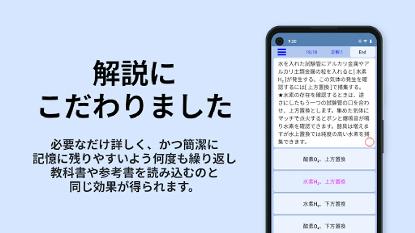 We will solve each question with a time limit of 20 seconds, and finally we will answer each other. Select once for each question, and the correct and incorrect answers will be displayed at the end of 15 questions or when you end halfway with the end button. The grades are scored, and the transition of the score becomes a graph and can be seen visually. In Test 15, the range of questions will be narrowed down, so you will be able to get a high score in a relatively short period of time by doing it. A mechanism close to the forgetting curve is adopted for the question interval and order.