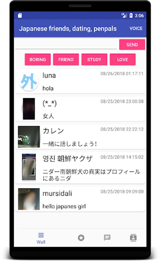 The app is very simple to use, anybody can post a message on a public wall and you can send them message (text, photo and stickers).