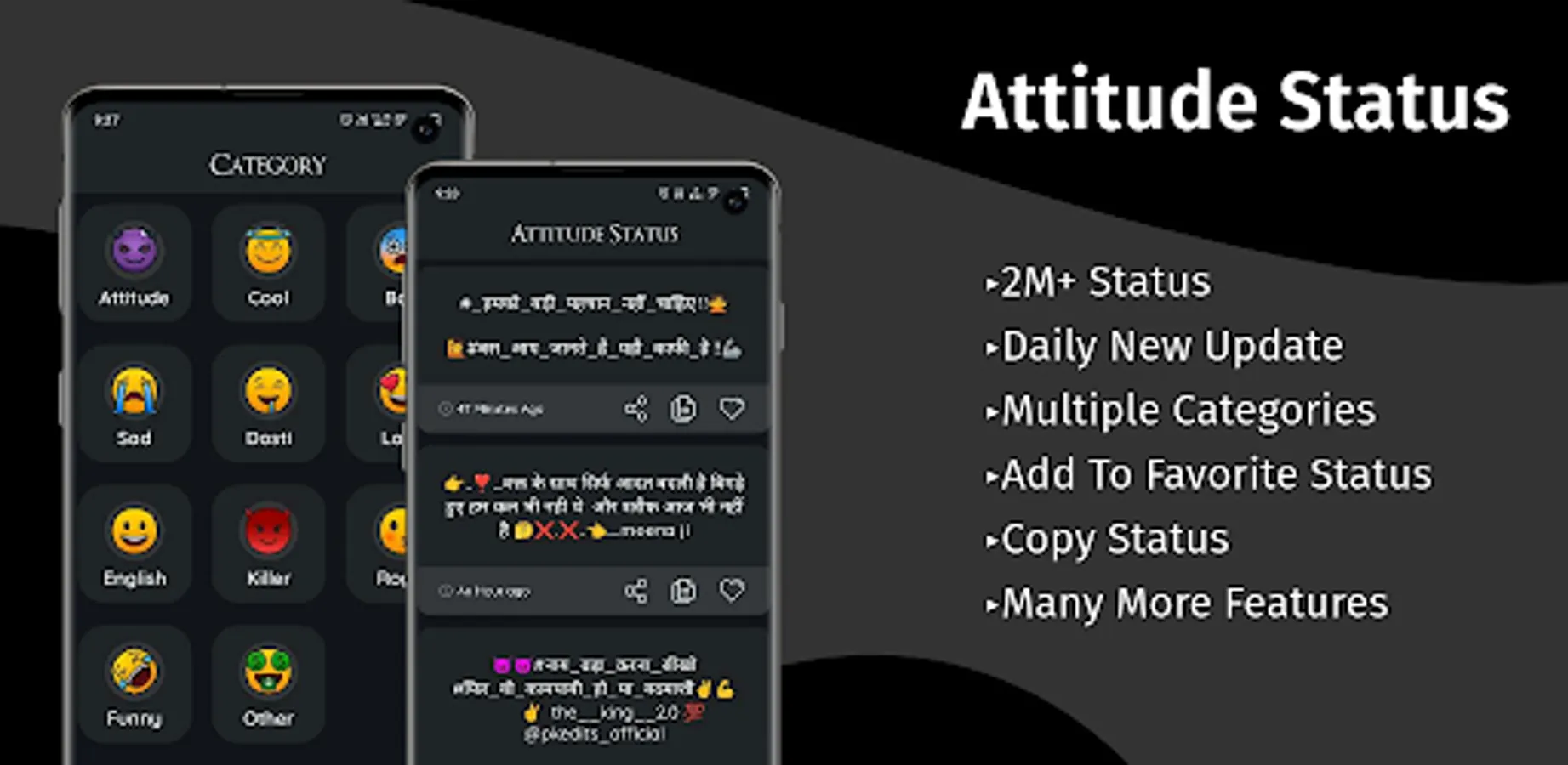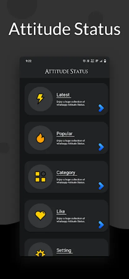 Attitude Status & Shayari app you can create an amazing status for WhatsApp in Hindi and English .🔥 Attitude Status & Shayari App has Various types of Latest Attitude Status. This app has a collection of some nice attitude statuses for WhatsApp.😎