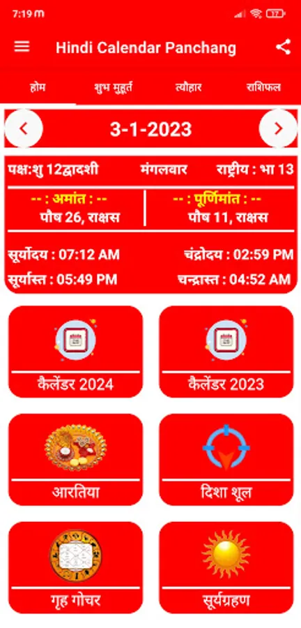 पंचांग 2024 हिंदी कैलेंडर ऐप में दैनिक आधार पर सभी राशिफल हैं - दैनिक राशिफल, मासिक राशिफल और वार्षिक राशिफल