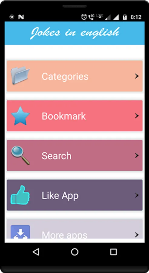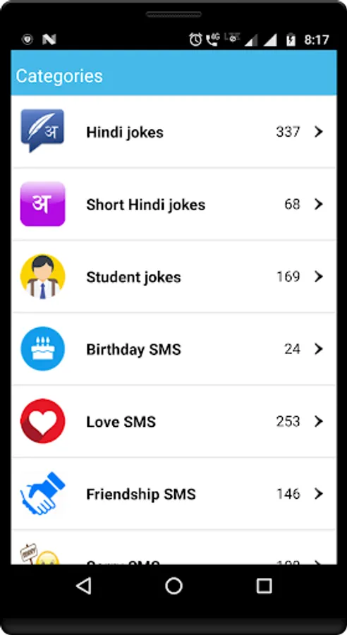 JOKES and sms app categories are HINDI JOKES, SHORT HINDI JOKES,STUDENT JOKES,BIRTHDAY SMS,LOVE SMS,FRIENDSHIP SMS,SORRY SMS,GOOD MORNING SMS,GOOD NIGHT SMS,GREETING SMS,WINTER SMS.
