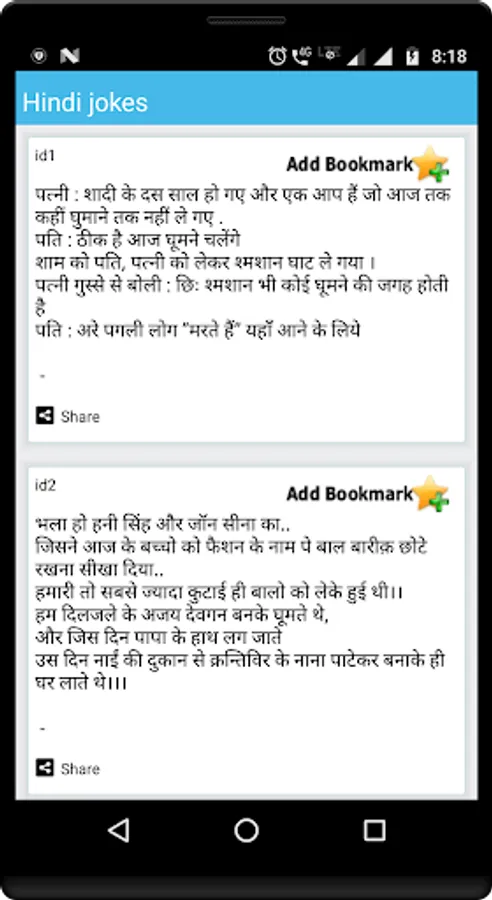 features of the app Joke collection in HINDI, For quick browsing set bookmark your favourite jokes, Share your jokes with friend using share option, Search joke using ID & text.