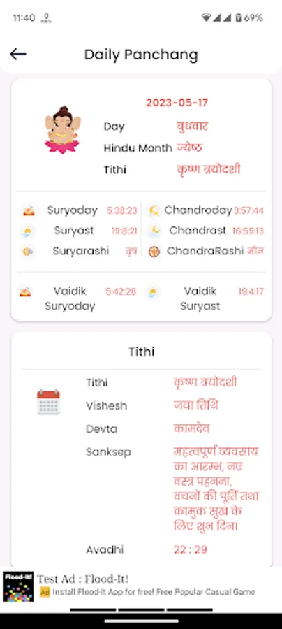 Our app provides you with daily Panchang which includes Tithi, Nakshatra, Yoga, Karana, and Var. You can use this information to plan your day accordingly.