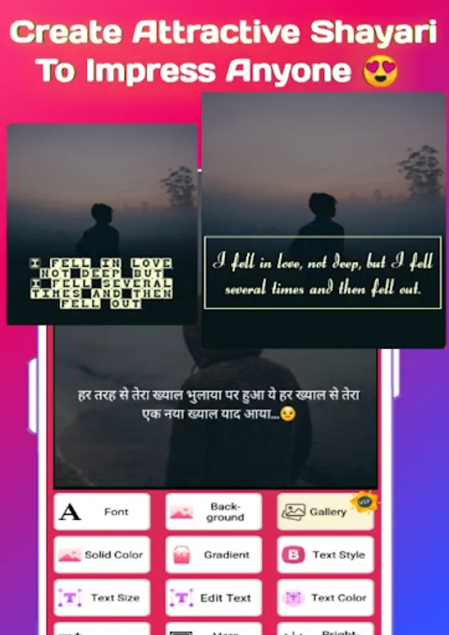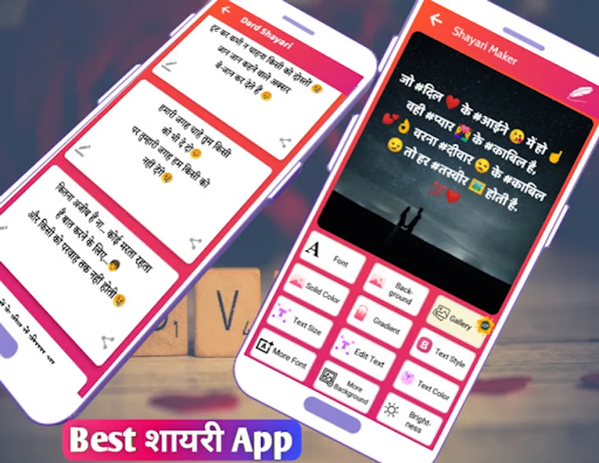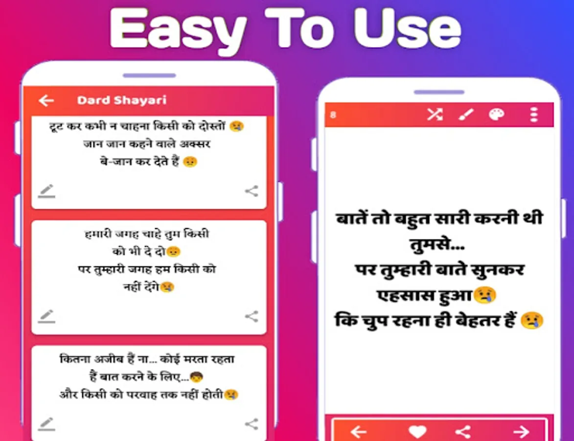 It is very easy to use and very colourful . This app brings all types of popular shayri categories like love heart touching sher shayari broken & Attitude status , pyar bhari romantic hindi shayari love sad and images and photos maker.