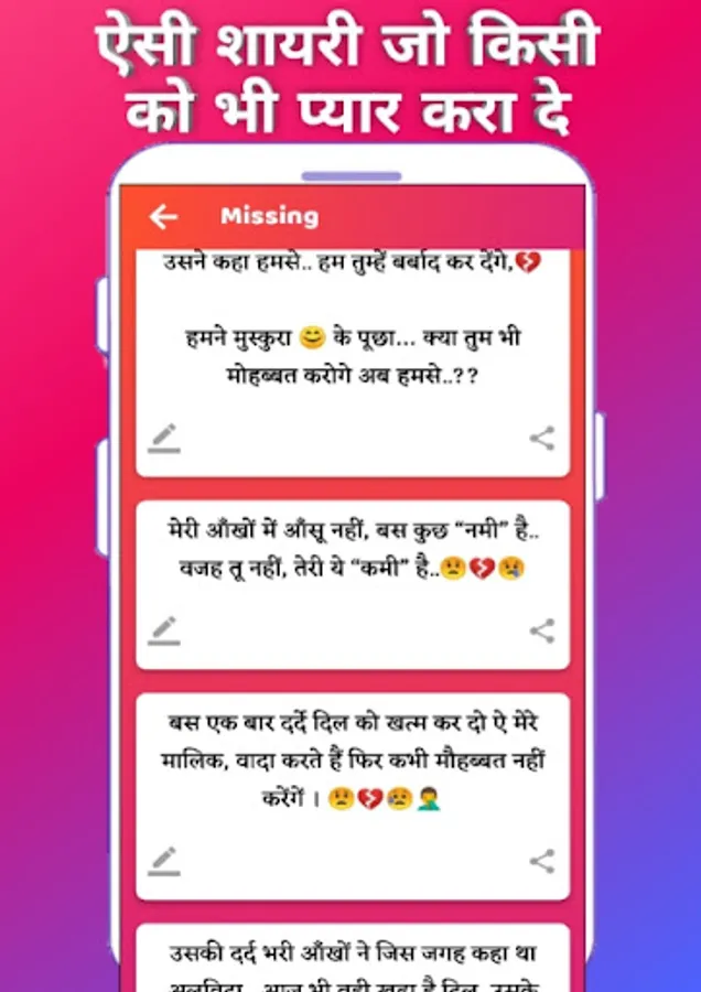 New best Hindi shayari & attitude Status shayari hindi me love shayari sad shayari romantic shayari, judai shayari , dard bhari shayari, Ishq, mohabbat, Hindi shayari app for you Love Hindi Shayari। शायरी . New hindi sher love sad is a pyar bhari shayari app. Here you are able to explore shayari for girlfriend or friends more than 20000+ shayari with cool emoji .