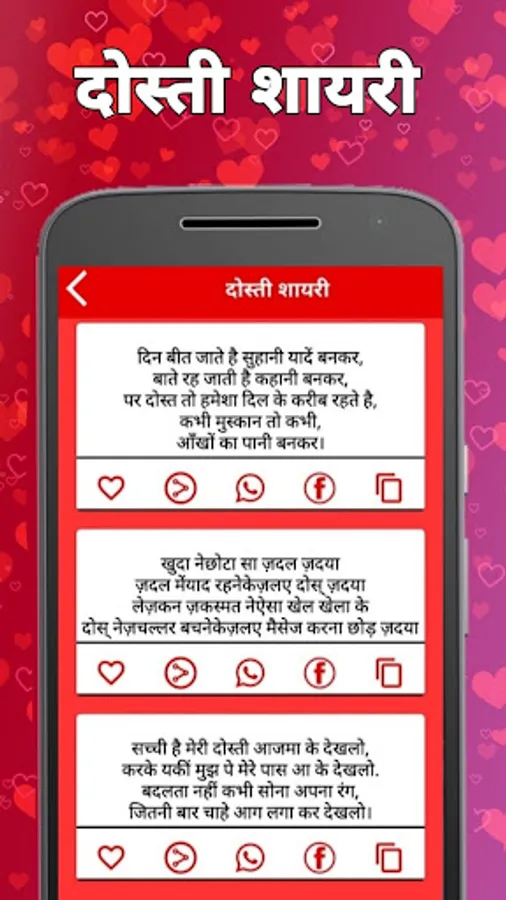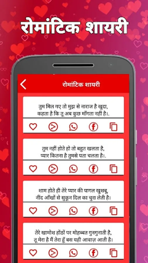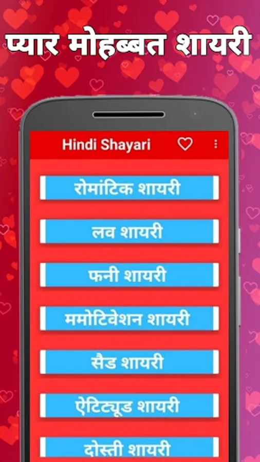 Hindi Shayari - लव शायरी हिंदी is collection of Hindi Shayari that include theme and emotion. Shayari is an effective way to express the feeling of a person in heart to present the good Romantic Shayari. Not only this app offers you romantic Shayari but it also offers occasional Hindi Shayari to share with your friends and loved ones.