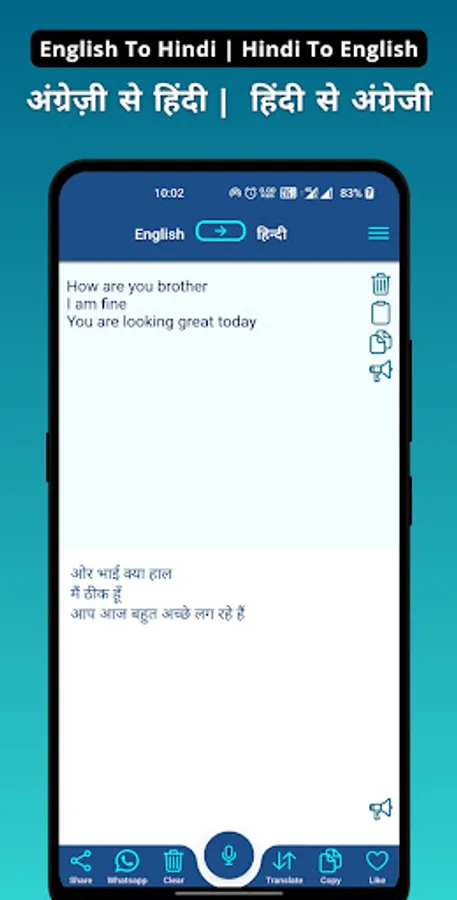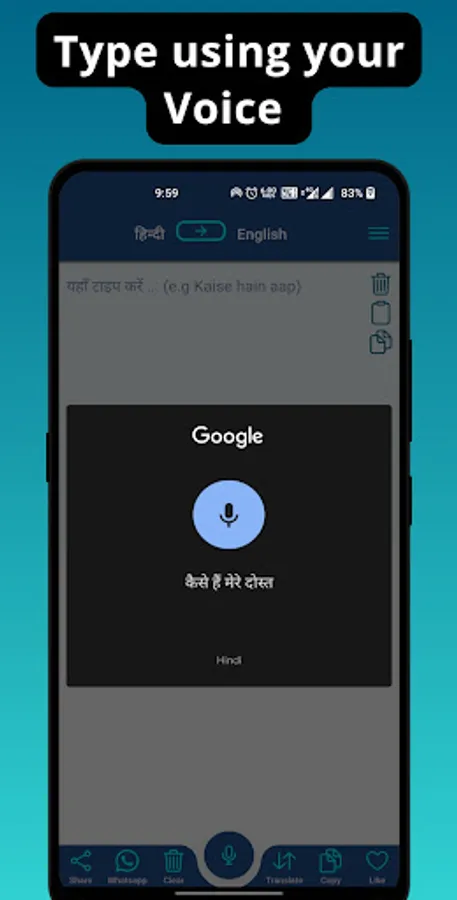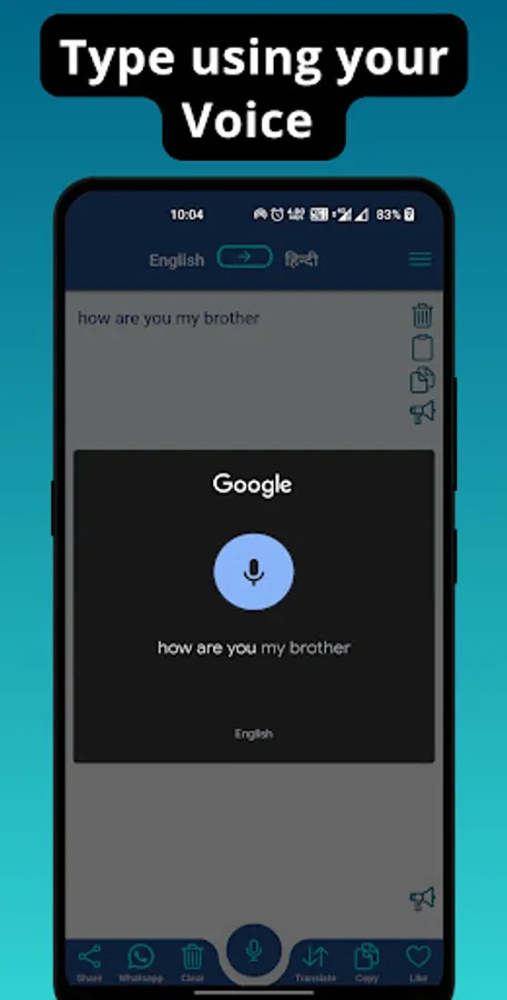 Hindi to English translator app is a free voice translator as well as text translator which translate Hindi to English or English to Hindi. It translates words as well as complete sentences. Best app for easy and fast translations. This app has speech to text feature by which you can type by just speaking in your voice and you will get your translation done.
