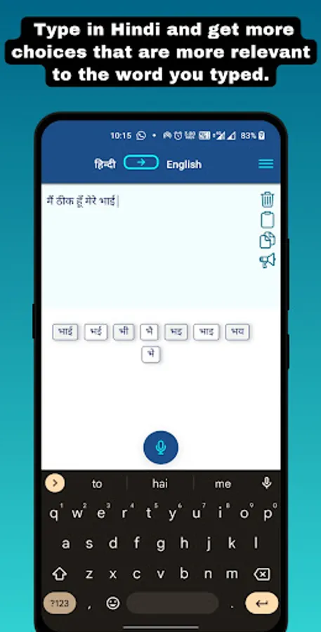 By using swap button at top you can also type in English. This make typing in English natural. As you type in Hindi character it will be automatically translate it into English alphabets. When you press the space more words at bottom of screen will appear containing more choice that are relevant to the word you just typed. You can type English using Hindi letter in a way you speak it. Once you are done with English typing you can use translate button at bottom to translate English texts into Hindi.
