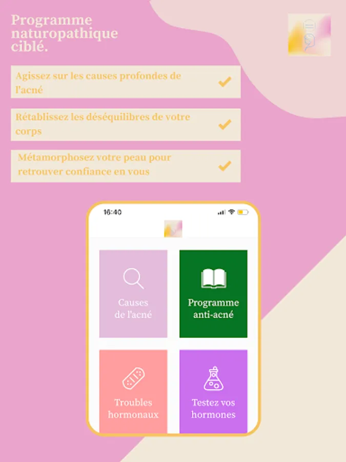 Dans cette application, vous agirez sur les causes fondamentales de votre acné à travers un programme naturopathique ciblé.