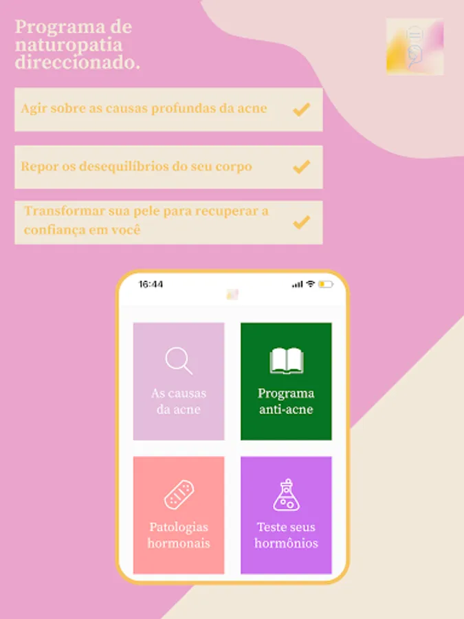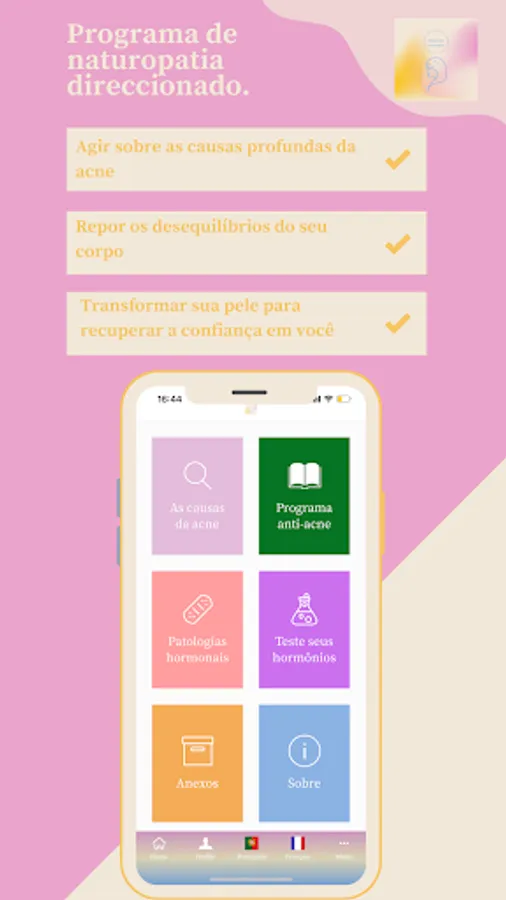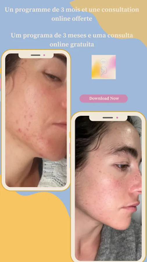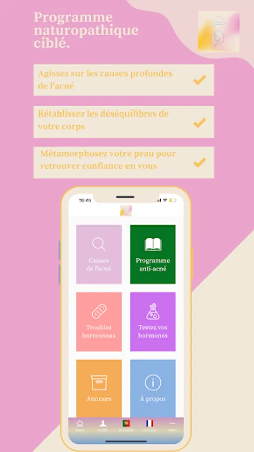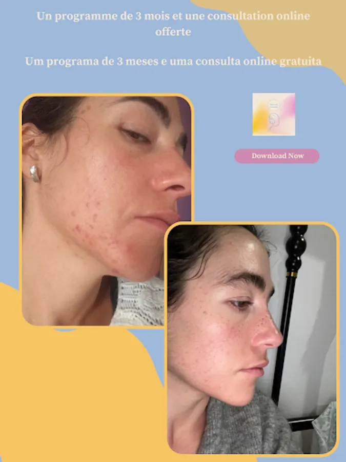 Neste programa, você vai descobrir uma seção especial "hormônios" para testar e entender seu papel na acne. São propostos protocolos para regular o que a Mãe Natureza pôs à vossa disposição. Esta aplicação tem o objetivo e ambição de acompanhá-la e ajudá-la a se livrar de sua acne permanentemente. Será efectuado um balanço no final do programa com uma consulta em videoconferência.