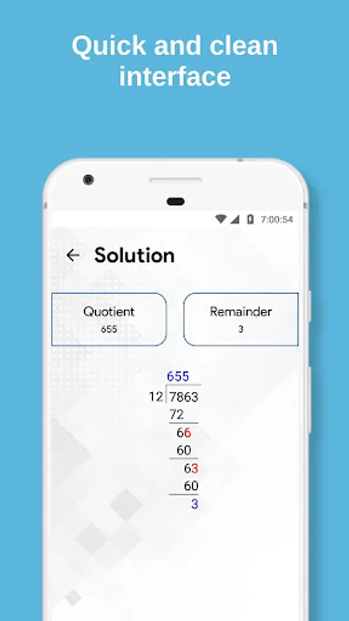 • You can view the Quotient, Remainder and Borrowed figures in an eye-catchy colorful manner.