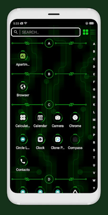 Modern style hi-tech launcher provides text search of apps and also by alphabates index which gives fast access to apps.