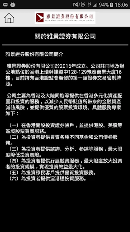 Acer king Securities International Limited (AKSIL) is licensed as SFC Type 1 (Dealing in Securities) licensed corporation and the subsidiary of Acer King Securities Limited (AKSL). The company has been developing diversified securities trading platforms to provide all-rounded investment services. Apart from the established phone order and online securities trading system, Acer king Securities International Limited is now offering a new mobile securities trading system for iOS devices. This new application operates quickly, smoothly and stably, aiding you to exploit every investment opportunities ahead at your fingertips.