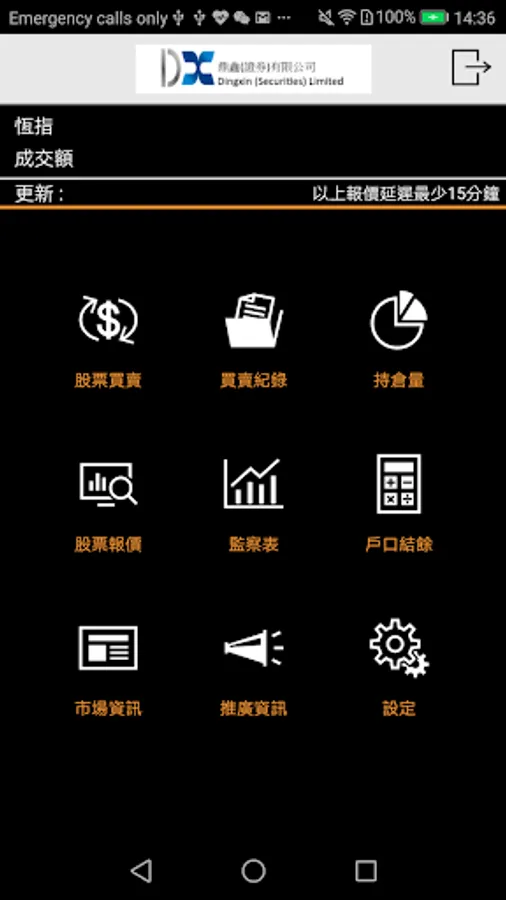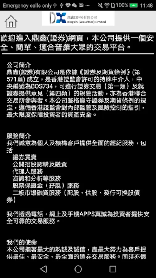 Clients who have registered the Dingxin (Securities) Limited Online Trading System (https://www.dingxinsec.com) can access the Mobile Trading System with the existing “Login ID” and the “Password”.