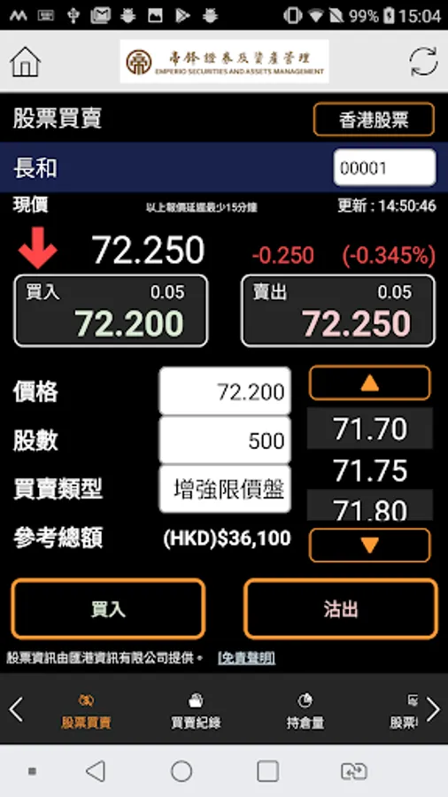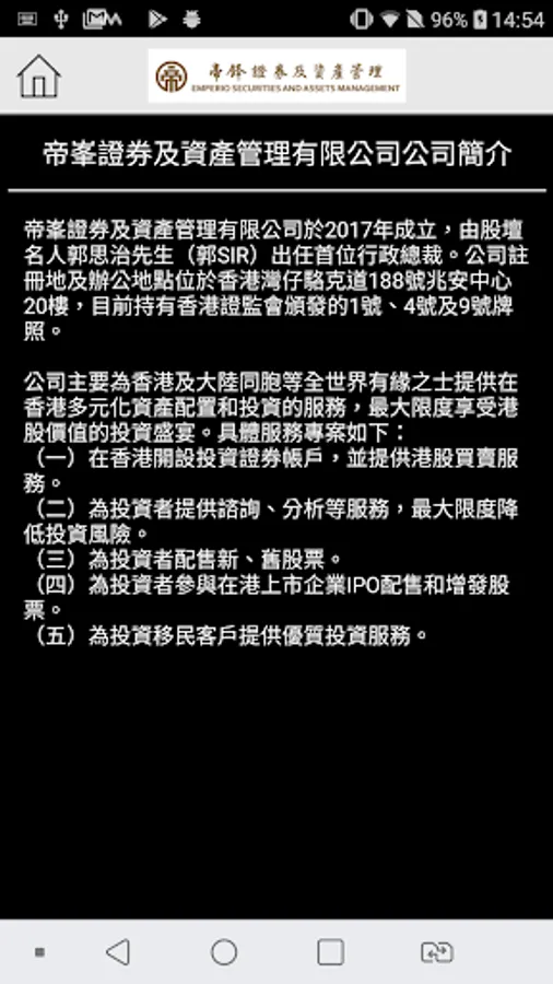 Emperio Securities and Assets Management Limited has been developing diversified securities trading platforms to provide all-rounded investment services. Apart from the established phone order and online securities trading system, Emperio Securities and Assets Management Limited is now offering a new mobile securities trading system for Android devices. This new application operates quickly, smoothly and stably, aiding you to exploit every investment opportunities ahead at your fingertips.
