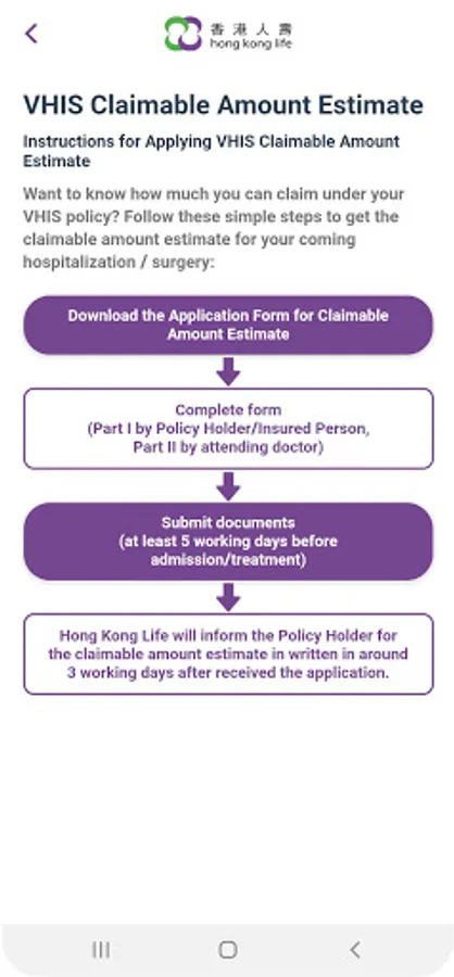 Prior to receiving medical services, customers may apply for an estimation of their claimable amount via the App for an anticipatory budgeting.