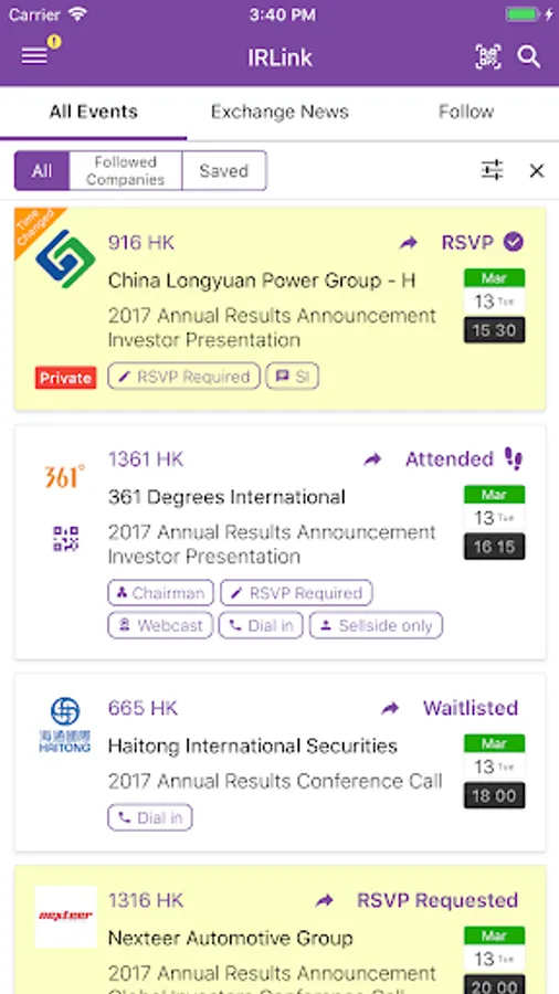* Meetings and roadshows: track corporate events hosted by listed companies, brokers and PR firms easily in our centralized event database through easy filter settings. Receive alert when a company you follow has posted a new event. You won’t miss any important events.