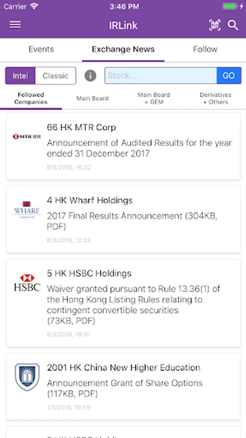 * Intelligent exchange news: IRLink is proud to be the first third-party mobile app for exchange news in Hong Kong. While we offer a Classic Mode to make scrolling through exchange news on your smart phone a highly pleasant experience, the Intelligent Mode displays only the most critical news in an easy-to-read format based on our in-house developed Smart Filters so that you can focus on what truly matters. Receive alerts for news posted by companies you have followed.