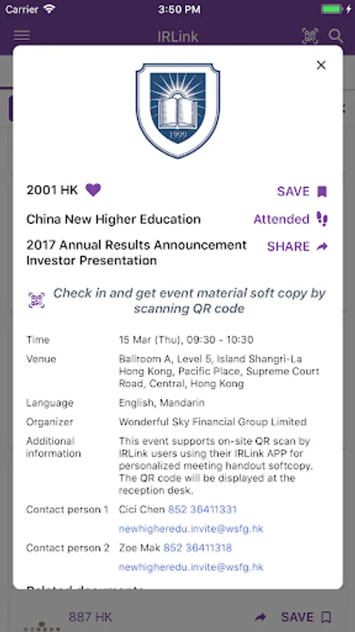 * Calendar management, instant booking and event check-in: save the desired events to your company email calendar instantly and easily; RSVP to events and get confirmation directly through IRLink. You can even check-in to events by scanning QR code from the APP, which also gives you permanent access to exclusive digital copy of the event PPT. It doesn’t get any easier than this.