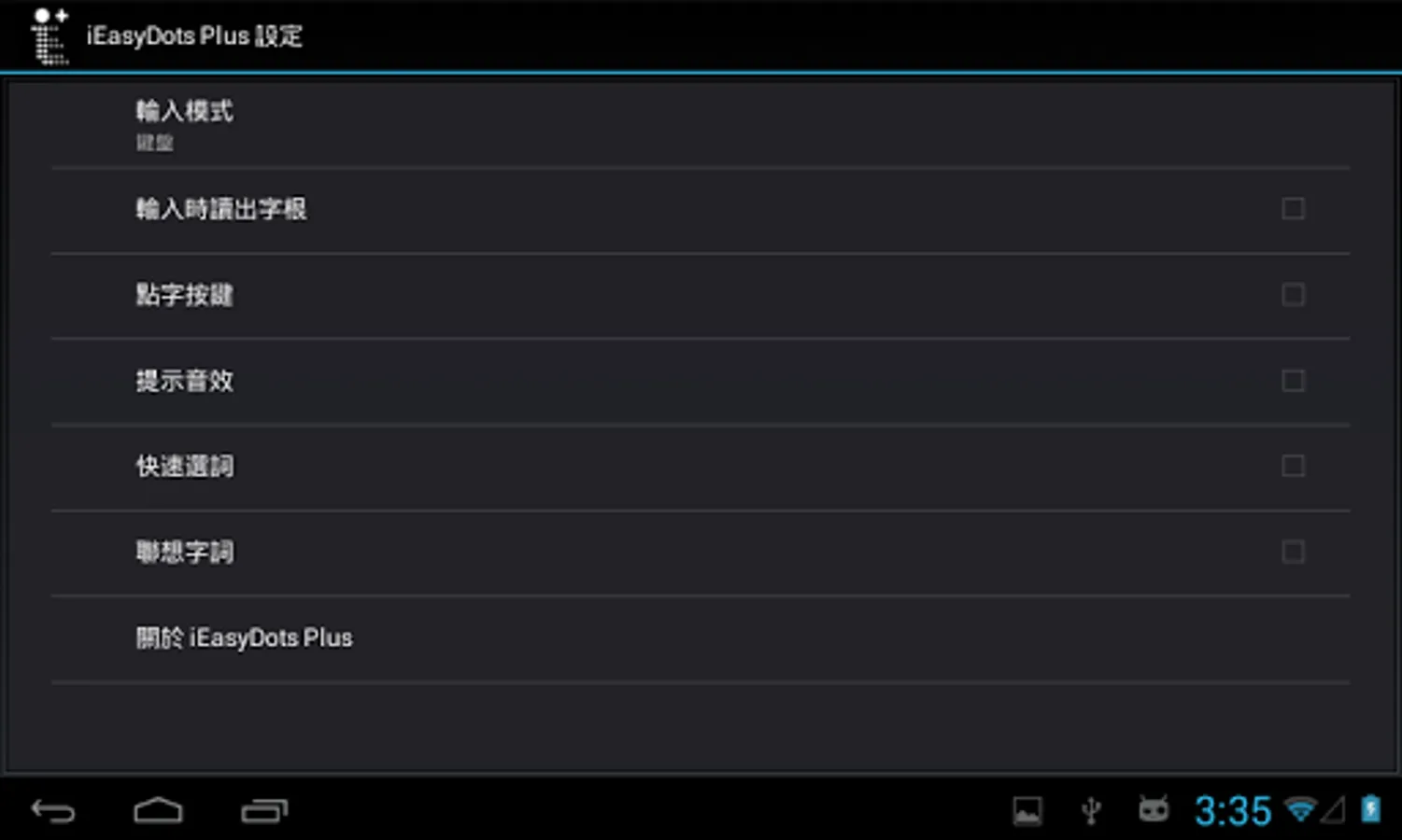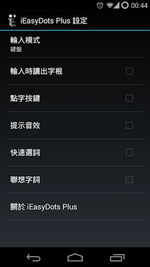 iEasyDots Plus is a 3rd party Chinese input method that operates under Android. It is designed for the visually impaired who use Cantonese braille. This app is based on EasyDots for PC, and provides additional input modes (such as pinyin, half-rect, join-dots, swipe-dots and six-dots, etc) to improve typing speed and accuracy. This input method also supports the use of physical keyboards.