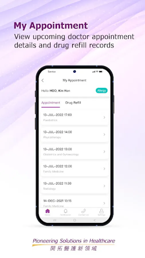 This 1-stop (CUHKMC Patient App) facilitates easy management of patient’s own health in a convenient and efficient way. Patient/registered next-of-kin(s) authorised by patient can access patient data via registered mobile phone(s). Functions, features and services (together, Services) provided through the (CUHKMC Patient App) include checking and managing appointments for clinical services, setting drug administration schedule and record keeping in one’s own hands.