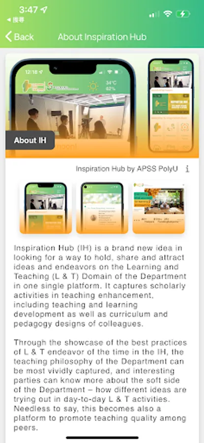 Inspiration Hub (IH) is a brand new idea in looking for a way to hold, share and attract ideas and endeavors on the Learning and Teaching (L & T) Domain of the Department in one single platform. It captures scholarly activities in teaching enhancement, including teaching and learning development as well as curriculum and pedagogy designs of colleagues.