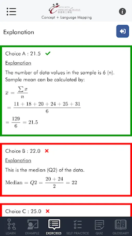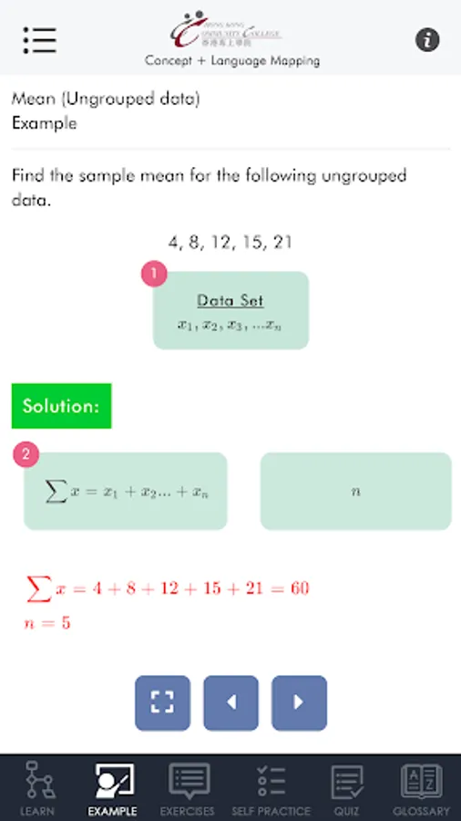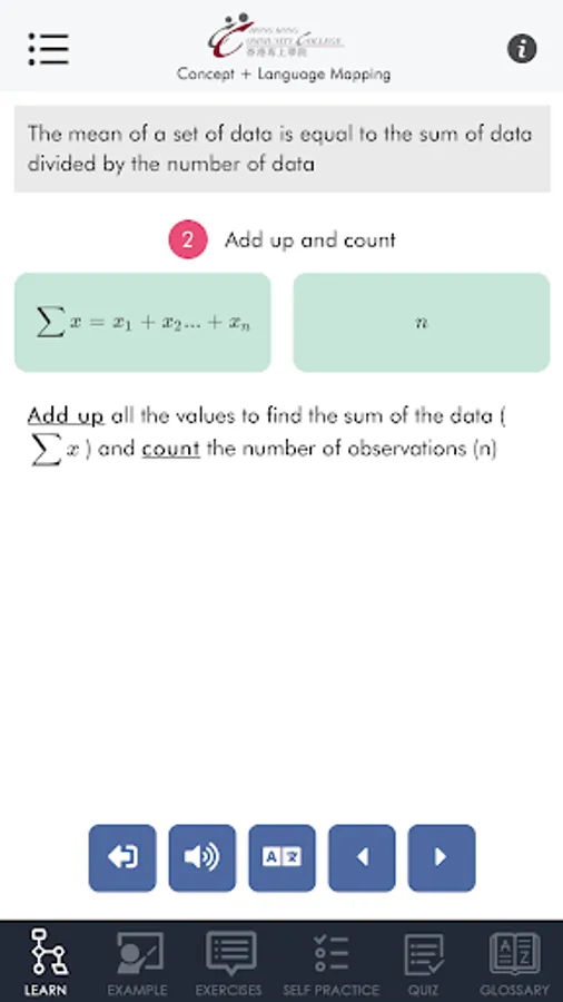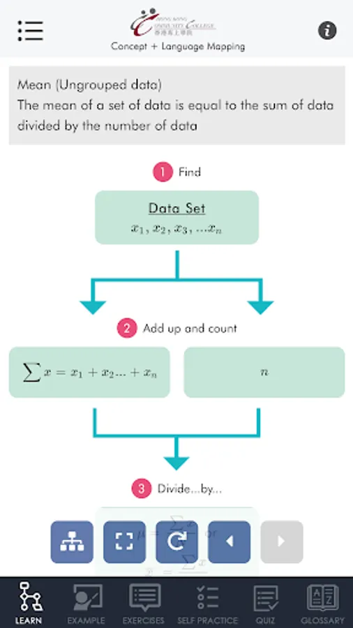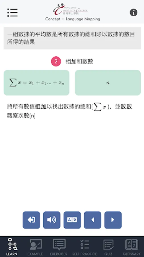 Funded by the Quality Enhancement Support Scheme (QESS) of the Self-financing Post-secondary Education Fund (SPEF), this animated bilingual “Concept + Language Mapping” (CLM) (Lin, 2018; He & Lin, 2019) digital application supports students' cross-linguistic and cross-modal transfer of prior math learning in a Content and Language Integrated Learning (CLIL) context. It provides a platform for students to review the key mathematical and statistical concepts through a CLIL approach, and under this approach language and subject content can be learnt together.