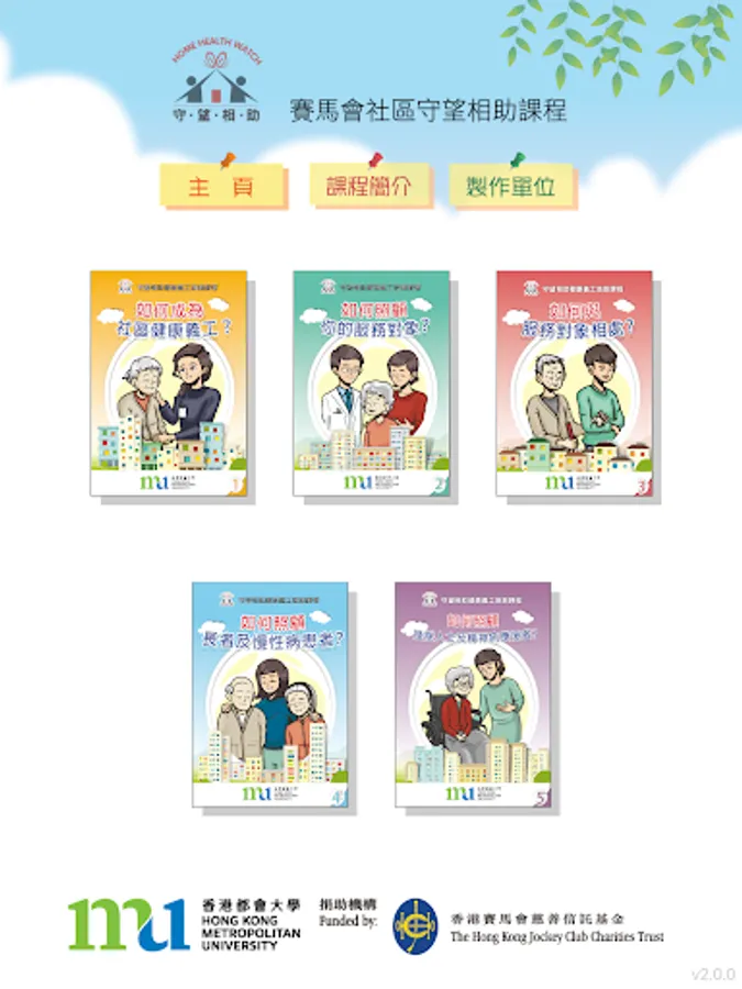 This App is part of the “Jockey Club Home Health Watch Programme”, which is organized by Hong Kong Metropolitan University and funded by The Hong Kong Jockey Club Charities Trust, aims to train community volunteers to provide timely, community-based support and care to the elderly, the disabled and individuals suffering from chronic diseases.