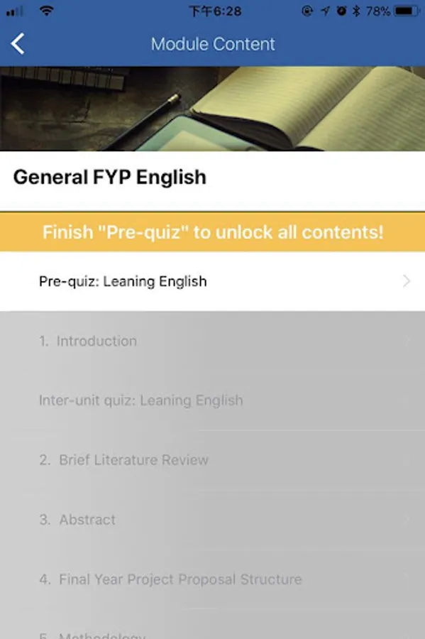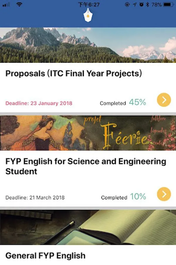 "The app has two major features: English language resources for Final Year Project (FYP)/Capstone projects and management of FYP/capstone project progress. The app offers general and discipline-specific English language resources to help undergraduate students at different stages of their FYP/Capstone projects. It includes learning about the major sections of a project proposal specific to the field of study, grammar and sentence structure tips, and skills needed to verbally present and defend their thesis. The app enables users to manage and keep track of their FYP/Capstone project ideas and in-app learning progress, make to-do lists, add reminders, bookmark learning content, receive and access relevant resources, communicate with their project supervisors, and more.